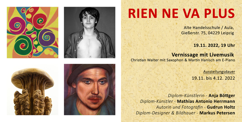 Lesung aus dem Fotobildband „Narben auf der Haut und in der Seele" von und mit der in Köln & Berlin lebenden Bremerin (Journalistin, Fotografin, Coach) Gudrun Holtz: 19.11. 2022, 19 Uhr rien ne va plus - Malerei, Fotografie und Skulptur von Anja Böttger, Mathias Antonio Herrmann, Gudrun Holtz, Markus Petersen