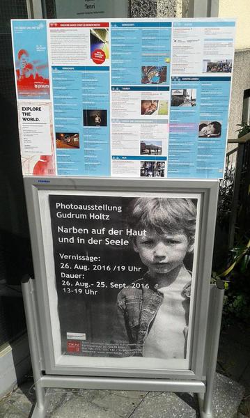 Vernissage am 26.8.2016 im Tenri, Deutsch-Japanische Kulturwerkstatt. Die Ausstellung dauert 3 Wochen und findet im Rahmen der Photokina, Köln statt. Auftakt der Wanderausstellung "Narben auf der
